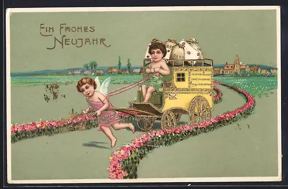 AK Neujahrsengel zieht eine Postkutsche mit Geldsäcken
