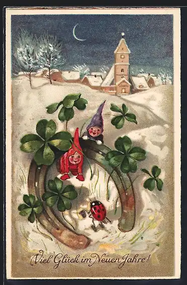 AK Neujahrsglückwünsche, Zwei Zwerge mit Marienkäfer und Kleeblättern auf einem Hufeisen bei Nacht