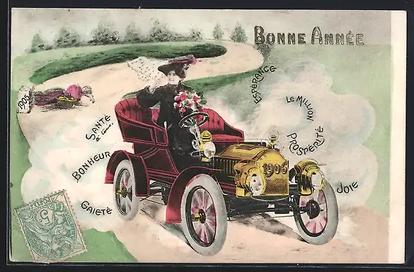 AK Neujahrsgratulantin 1908 fährt im Auto vor