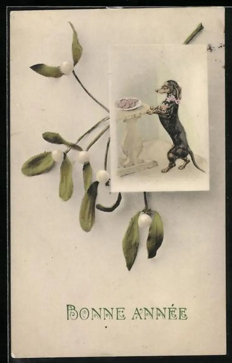 AK Neujahrsgrüsse, Dackel stellt sich an einen Tisch mit Wurstteller