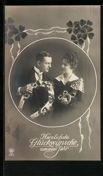 AK Neujahrsgruss, Ein Paar mit Hufeisen und Glückspilz