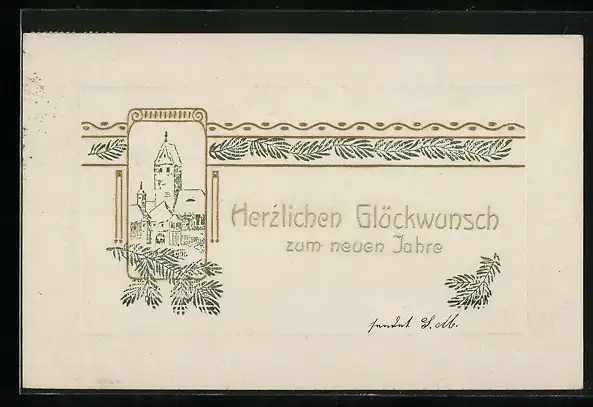 AK Neujahrsgruss, Kirche mit Tannenzweigen