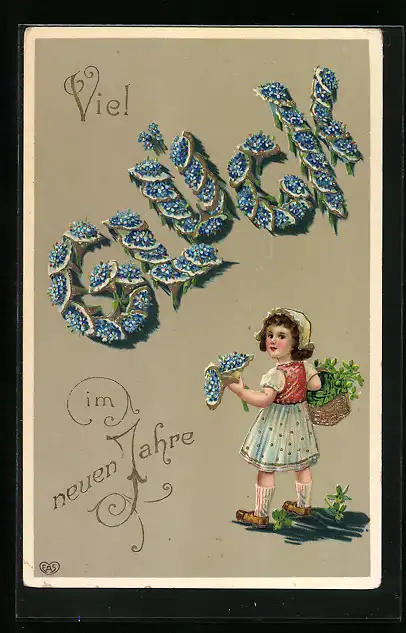 AK Neujahrsgruss, Kleines Mädchen mit Kleeblättern und Vergissmeinnicht