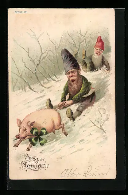 AK Neujahrsgruss, Zwerge versuchen ein Schwein zu bändigen
