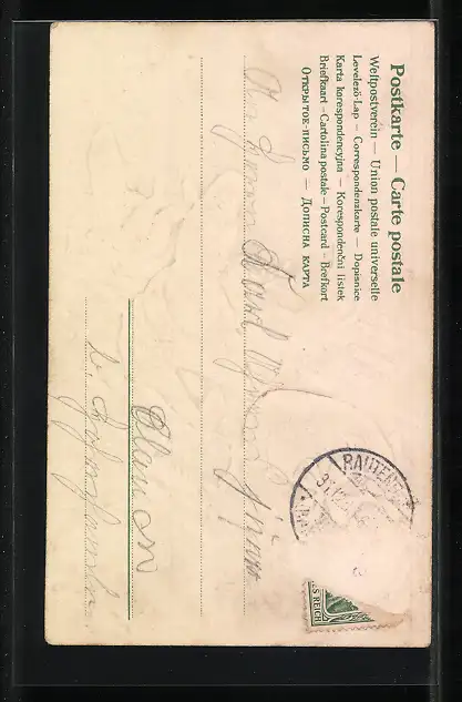 alte Ansichtskarte, gelaufen, Briefmarke entfernt, rückseitig Oberflächenschaden, guter Zustand