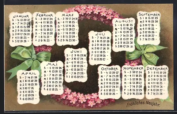 AK Neujahrsgruss mit Kalender und Blumenkranz