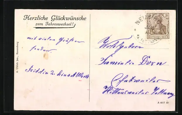 Personenbezogene Daten auf der Rückseite der Karte wurden durch blauen Textmarker unkenntlich gemacht. Die blauen Stellen sind auf die Vorderseite durchgeweicht und wirken sich negativ auf das Postkartenfoto aus