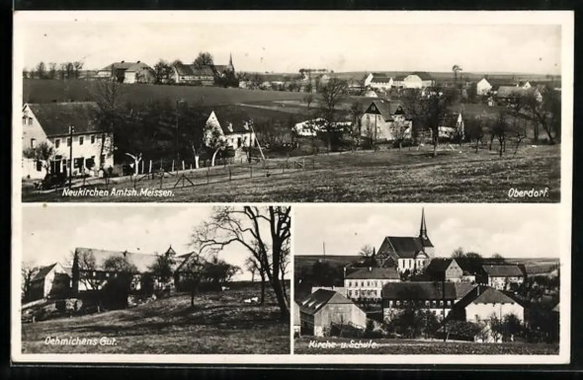 AK Neukirchen /Meissen, Oberdorf, Oehmichens Gut, Kirche mit Schule