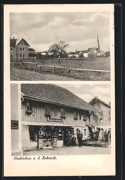 AK Neukirchen a. d. Enknach, Ansicht der Gemischtwarenhandlung, Teilansicht mit Kirche