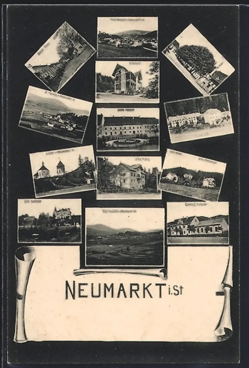 AK Neumarkt i. St., Villa Maly, Kirche, Villa Reiterer