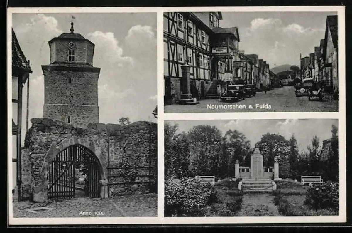 AK Neumorschen a. Fulda, Kirche und Denkmal mit Grünanlagen