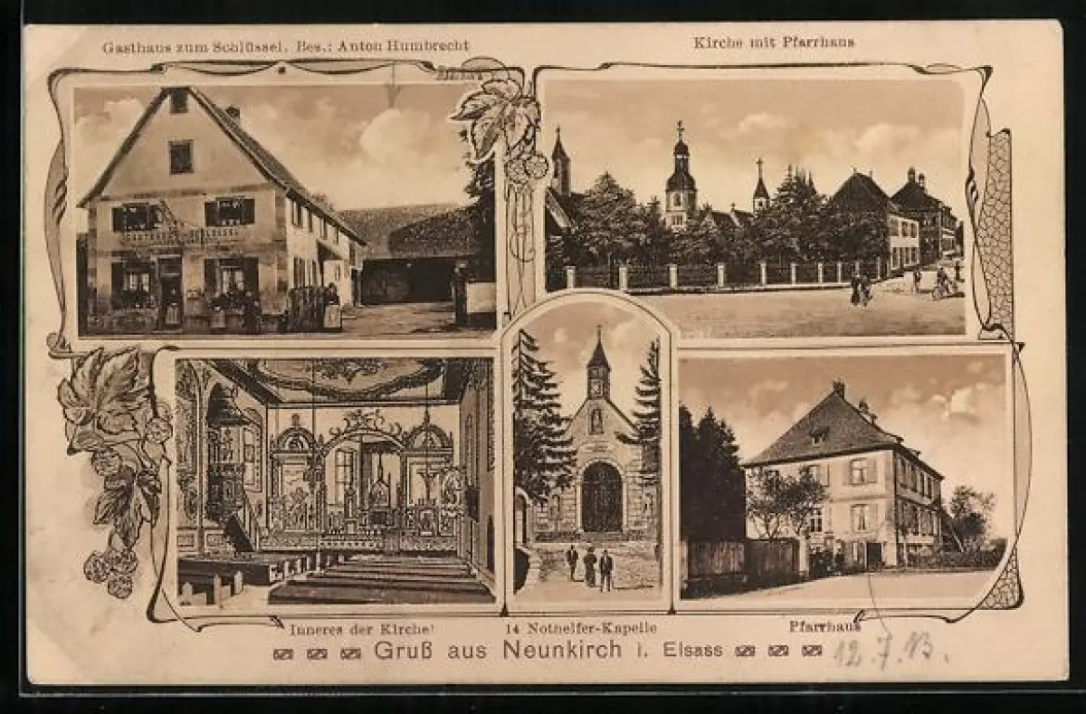 AK Neunkirch i. Elsass, Gasthaus zum Schlüssel, Bes. Anton Humbrecht, Kirche mit Pfarrhaus