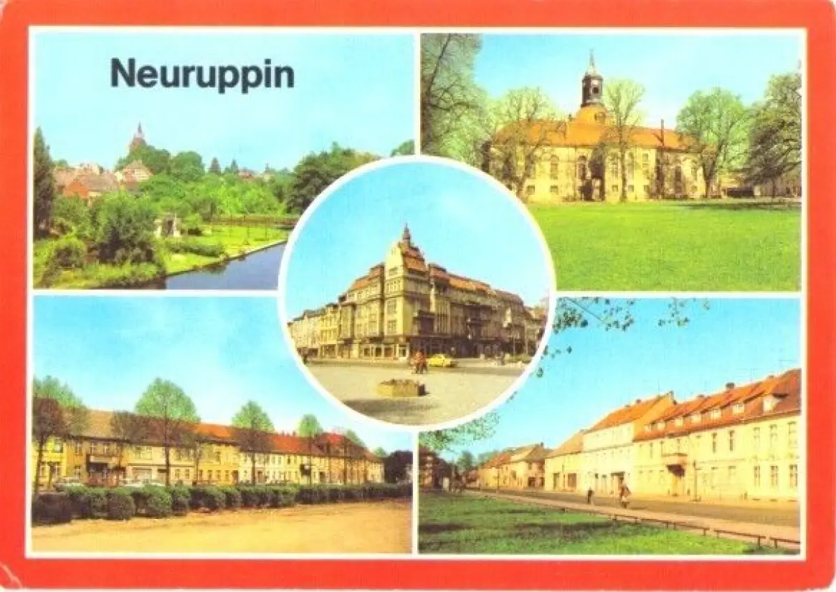 Ansichtskarte Neuruppin 5 Abb., Alt Ruppin, Pfarrkirche, Am Ernst-Thälmann-Platz, Karl-Marx-Straße, OdF-Platz / Ecke Karl-Marx-Straße Erhaltung II, Ecken etwas angestossen postalisch gelaufen, gestempelt: Neuruppin 1, 12.7.83 Druckvermerk: 1983 Herstellungsland: DDR Verlag: Bild und Heimat Reichenbach - 01 04 0253