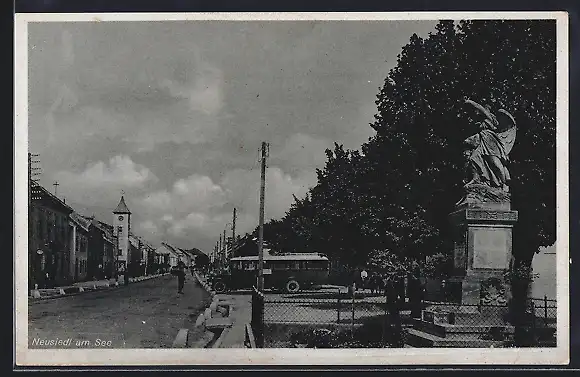 AK Neusiedl, Strassenpartie mit Denkmal und Bus