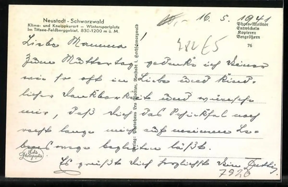 Personenbezogene Daten auf der Rückseite der Karte wurden durch blauen Textmarker unkenntlich gemacht. Die blauen Stellen sind auf die Vorderseite durchgeweicht und wirken sich negativ auf das Postkartenfoto aus