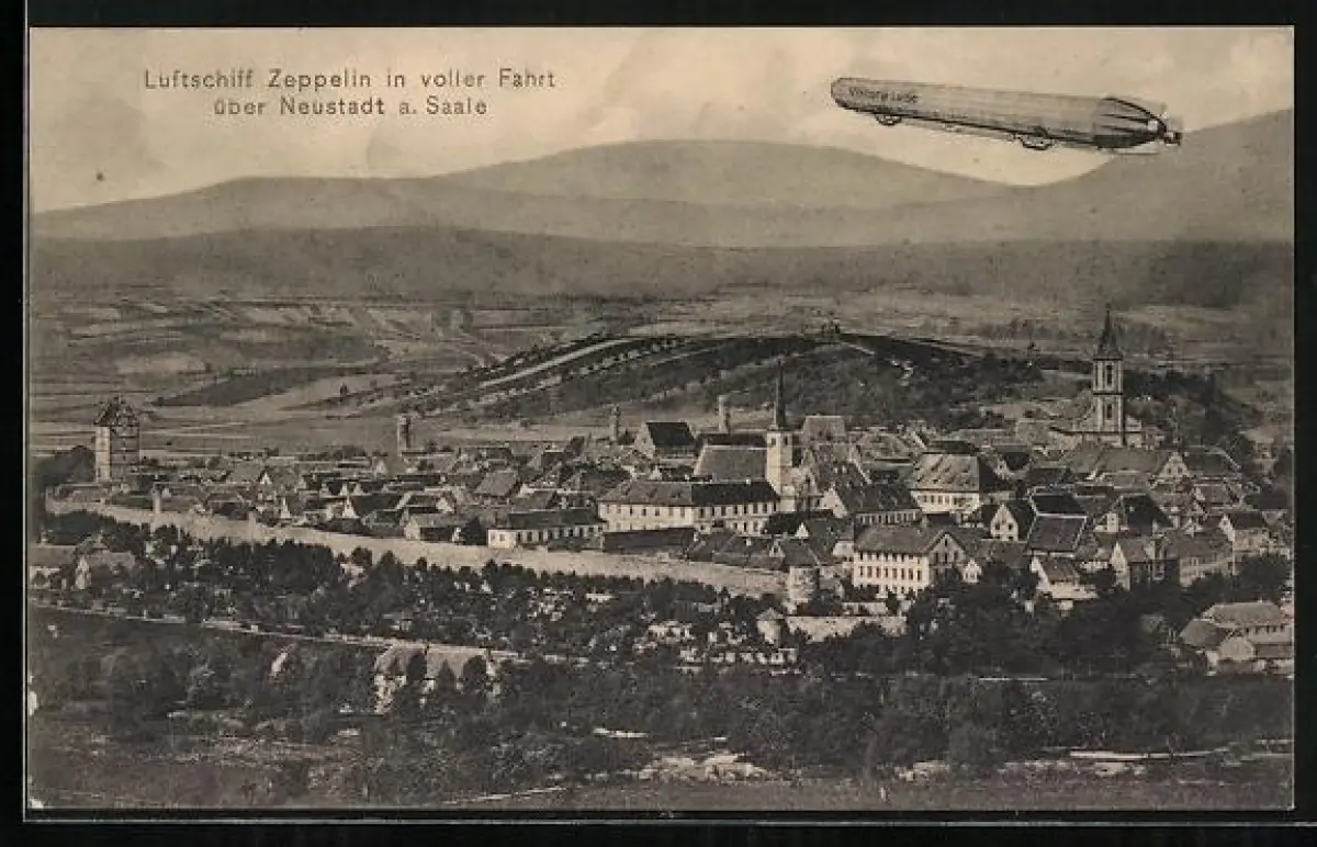 AK Neustadt a. Saale, Luftschiff Zeppelin in voller Fahrt über der Stadt