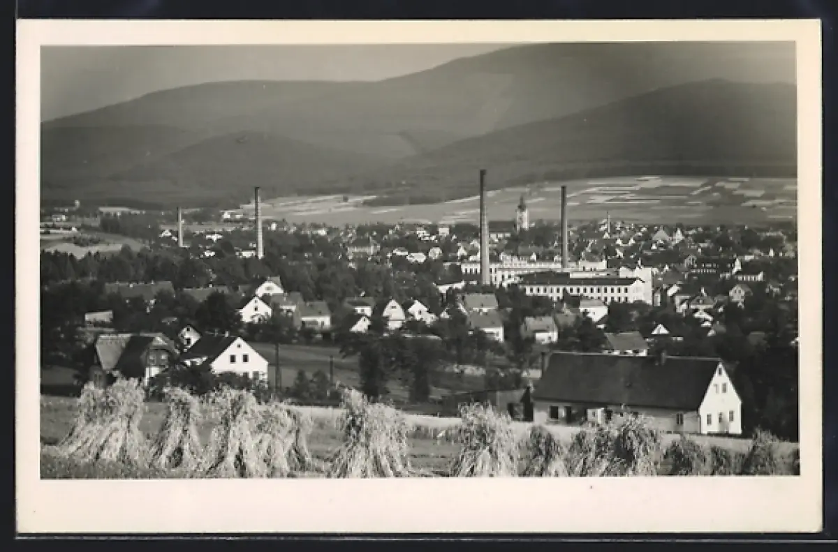 AK Neustadt a. T., Ortsansicht mit Fabriken und Heuschobern