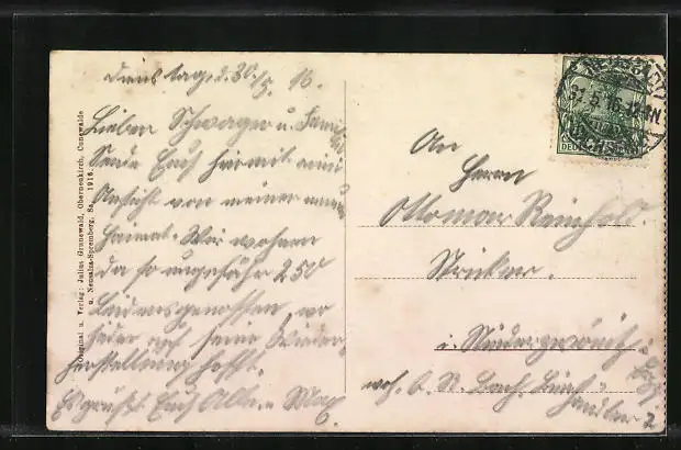 Personenbezogene Daten auf der Rückseite der Karte wurden durch blauen Textmarker unkenntlich gemacht. Die blauen Stellen sind auf die Vorderseite durchgeweicht und wirken sich negativ auf das Postkartenfoto aus
