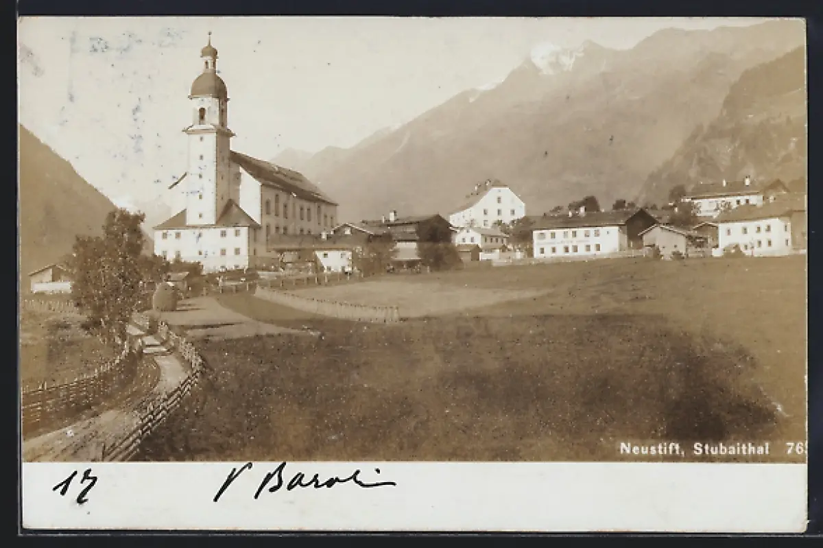 AK Neustift /Stubaithal, Ortsansicht mit Strasse und Kirche, Bergpanorama