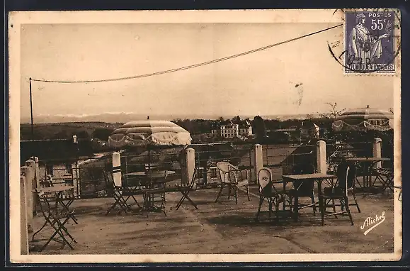 AK Neuvic, Terrasse de l`hôtel Bellevue avec vue sur les montagnes du Cantal