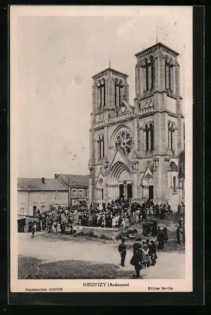 AK Neuvizy, Gläubige vor dem Eingang der Doppelturmkirche