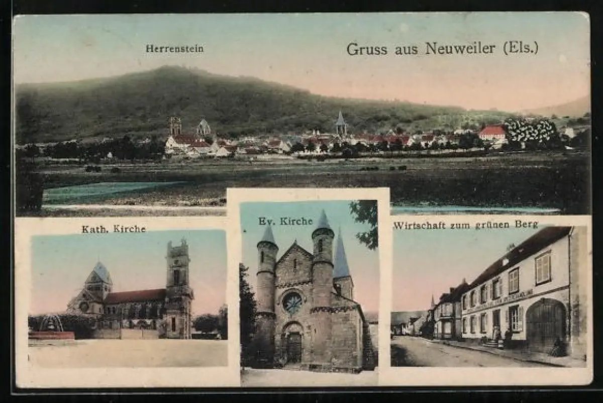 AK Neuweiler /Els., Gasthaus zum grünen Berg, Ev. Kirche, Kath. Kirche