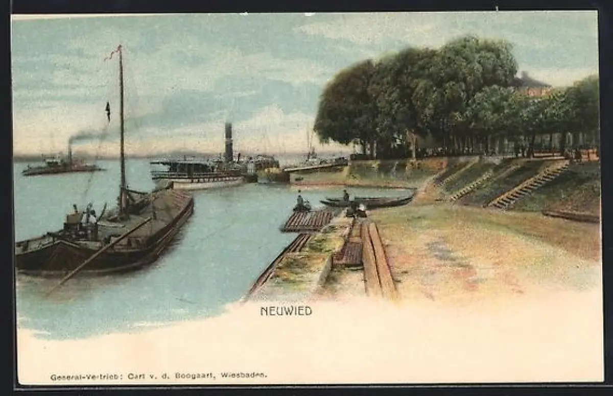 AK Neuwied, Hafenpartie mit Floss u. Dampfer