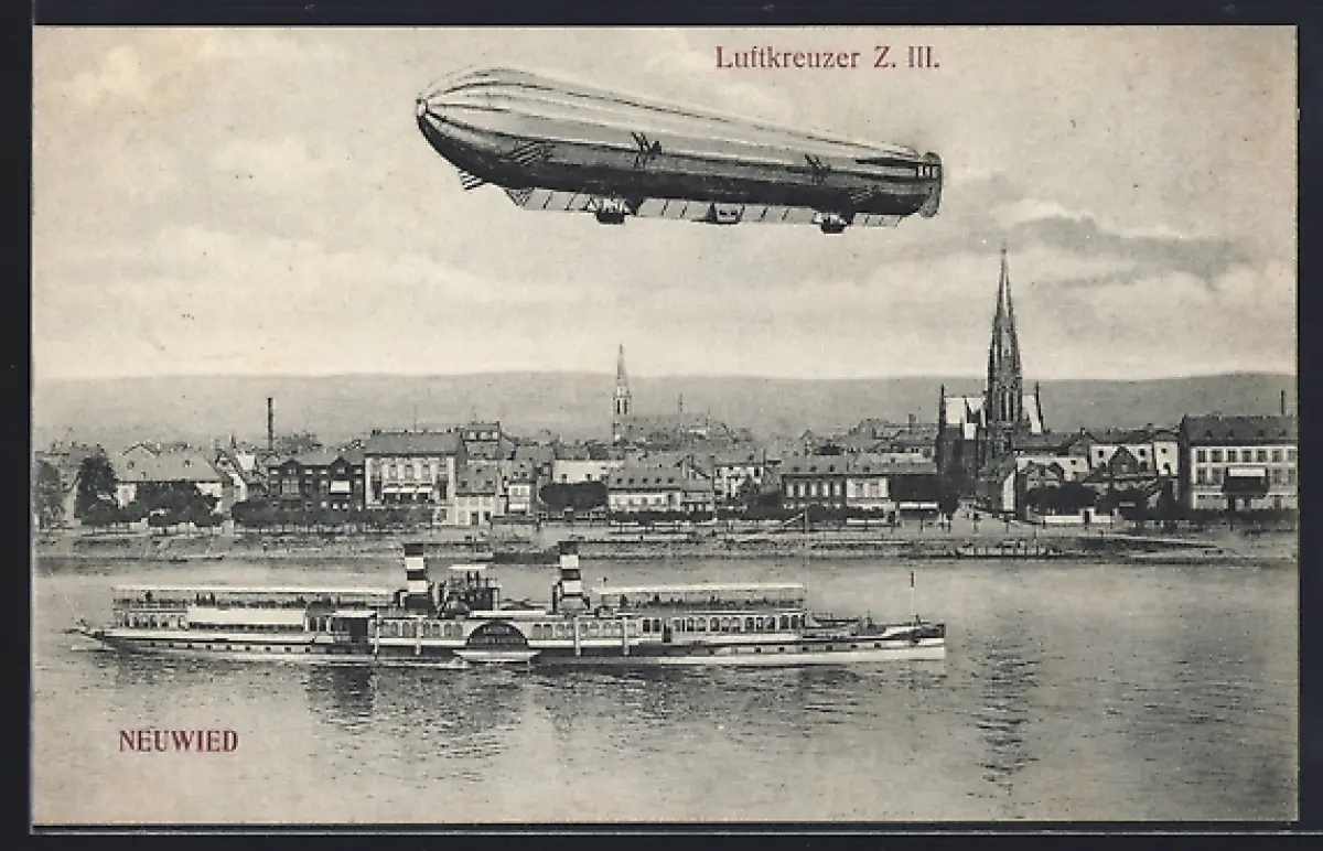 AK Neuwied, Luftschiff Z III und Raddampfer