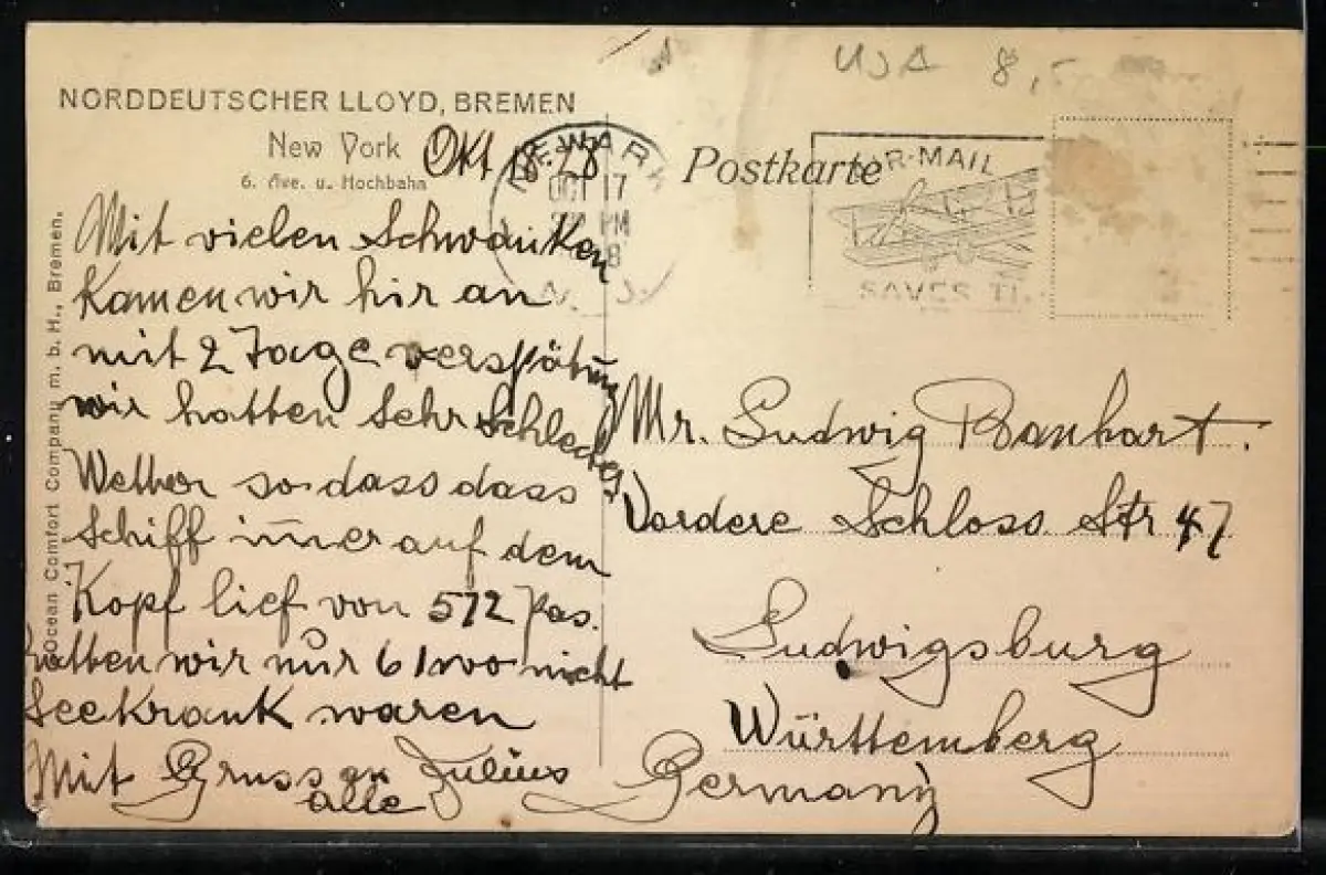 Personenbezogene Daten auf der Rückseite der Karte wurden durch blauen Textmarker unkenntlich gemacht. Die blauen Stellen sind auf die Vorderseite durchgeweicht und wirken sich negativ auf das Postkartenfoto aus