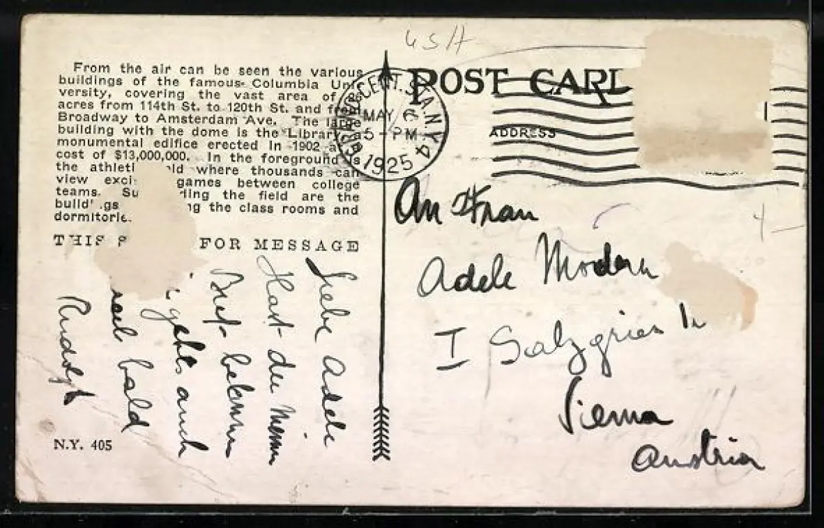 Personenbezogene Daten auf der Rückseite der Karte wurden durch blauen Textmarker unkenntlich gemacht. Die blauen Stellen sind auf die Vorderseite durchgeweicht und wirken sich negativ auf das Postkartenfoto aus