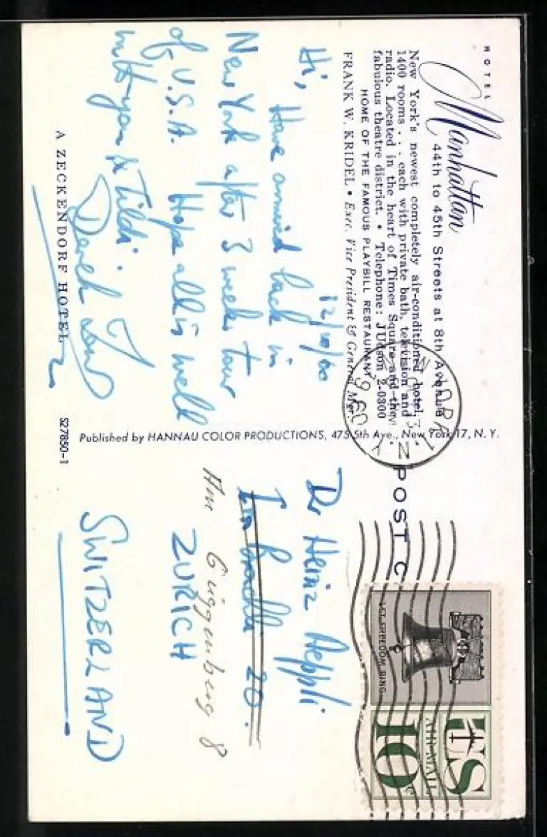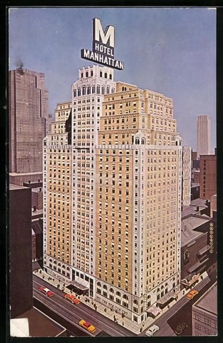 AK New York, NY, Hotel Manhattan, 44th to 45th Streets at 8th Avenue, Gen. Mgr. Frank W. Kridel