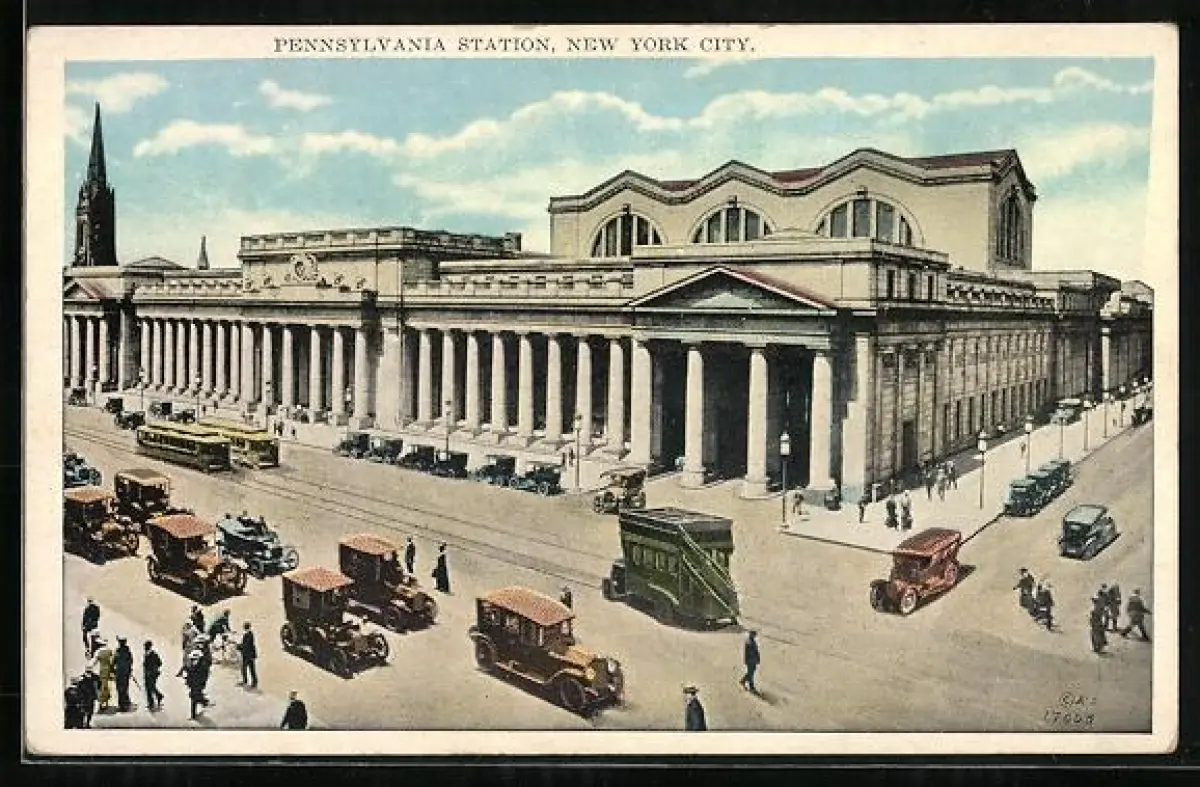 AK New York, NY, Pennsylvania Station, Strassenbahnen vor dem Bahnhof