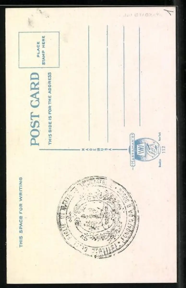 Personenbezogene Daten auf der Rückseite der Karte wurden durch blauen Textmarker unkenntlich gemacht. Die blauen Stellen sind auf die Vorderseite durchgeweicht und wirken sich negativ auf das Postkartenfoto aus