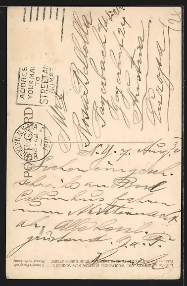 Personenbezogene Daten auf der Rückseite der Karte wurden durch blauen Textmarker unkenntlich gemacht. Die blauen Stellen sind auf die Vorderseite durchgeweicht und wirken sich negativ auf das Postkartenfoto aus