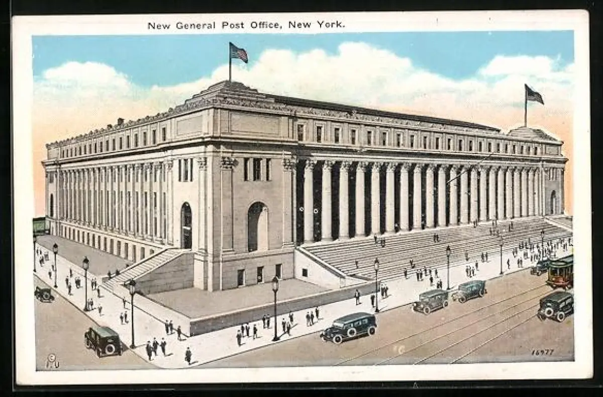 AK New York, New General Post Office Strassenansicht mit Autos und Strassenbahn davor, US-Fahnen auf dem Dach