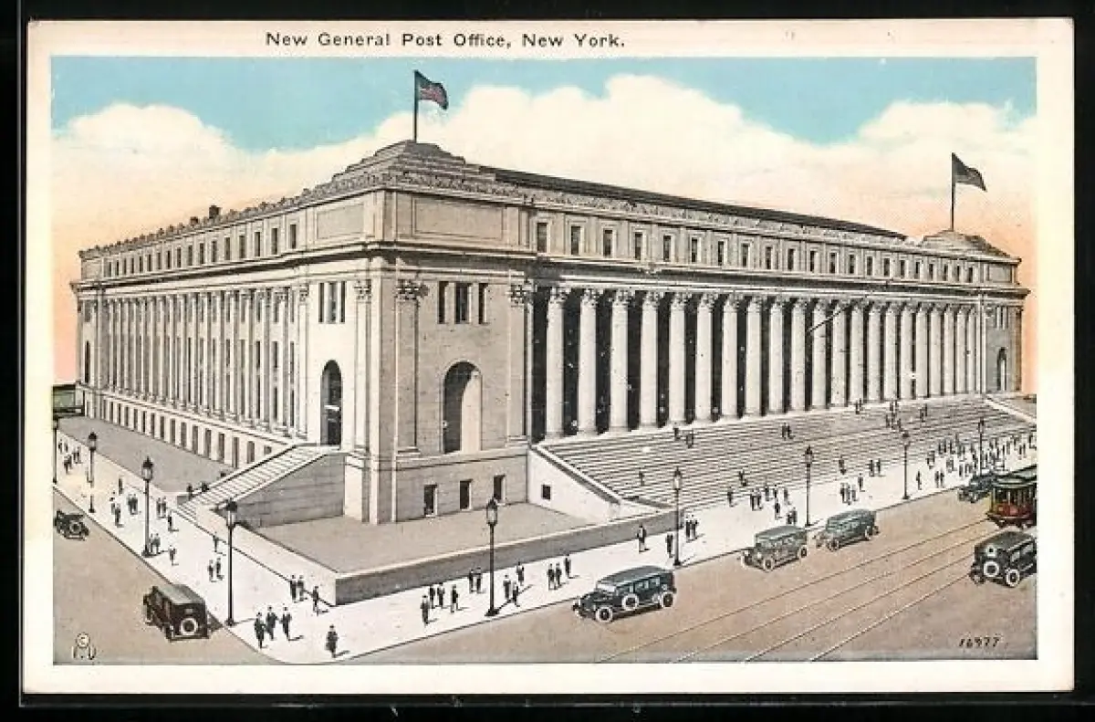 AK New York, New General Post Office Strassenansicht mit Autos und Strassenbahn davor, US-Fahnen auf dem Dach