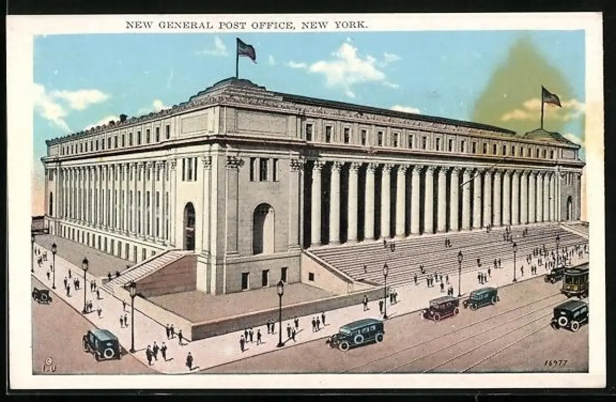 AK New York, New General Post Office Strassenansicht mit Autos und Strassenbahn davor, US-Fahnen auf dem Dach