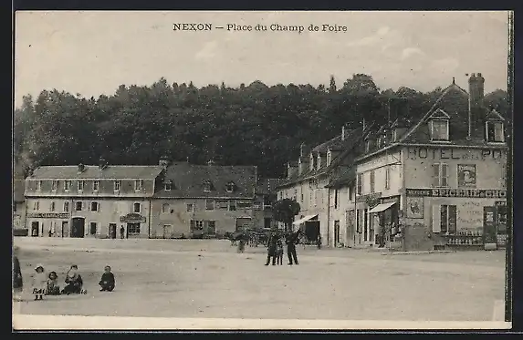 AK Nexon, Place du Champ de Foire avec bâtiments et forêt en arrière-plan