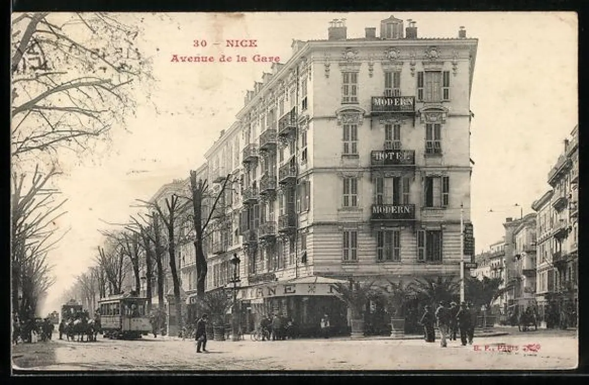 AK Nice, Avenue de la Gare avec tram et immeuble Hôtel Moderne