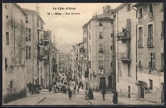 AK Nice, Rue Rossetti animée avec des passants et des bâtiments historiques