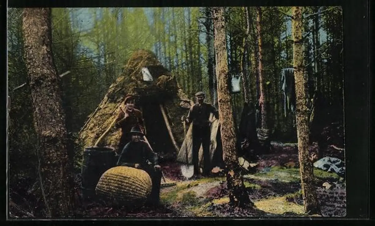 AK Niebeck /Lüneb. Heide, Drei Köhler vor ihrer Hütte im Wald