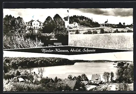 AK Nieder-Kleveez, Teilansicht mit Kirche, Blick auf den See