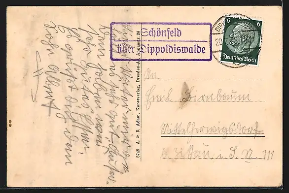 Personenbezogene Daten auf der Rückseite der Karte wurden durch blauen Textmarker unkenntlich gemacht. Die blauen Stellen sind auf die Vorderseite durchgeweicht und wirken sich negativ auf das Postkartenfoto aus