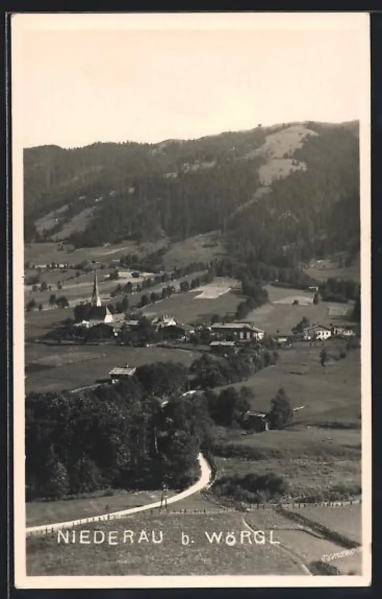AK Niederau b. Wörgl, Gesamtansicht des Ortes mit Gebirgspanorama