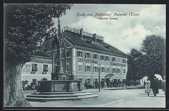 AK Niederdorf /Pustertal, Gasthof Emma mit Denkmal
