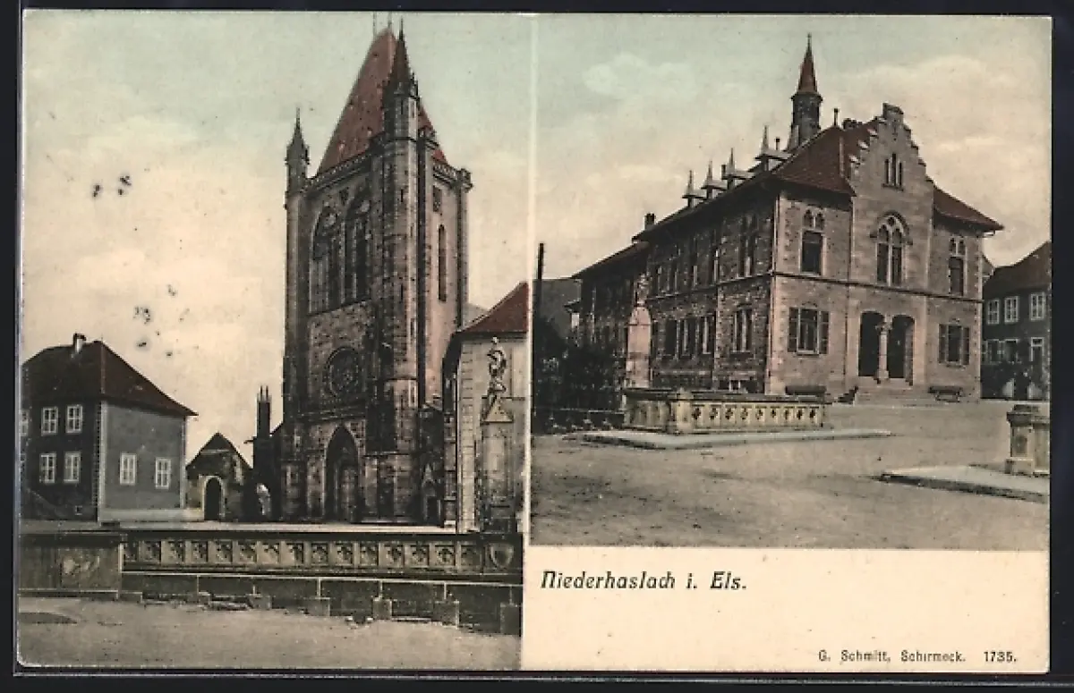 AK Niederhaslach i. Els., Kirche, Rathaus mit Denkmal