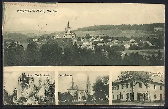 AK Niederkappel /Ob.-Öst., Fr. Amerstorfer`s Handlung, Ruine Haichenbach, Pfarrkirche