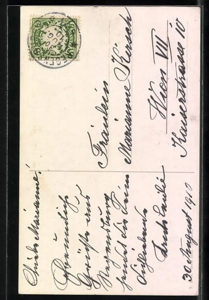 Personenbezogene Daten auf der Rückseite der Karte wurden durch blauen Textmarker unkenntlich gemacht. Die blauen Stellen sind auf die Vorderseite durchgeweicht und wirken sich negativ auf das Postkartenfoto aus