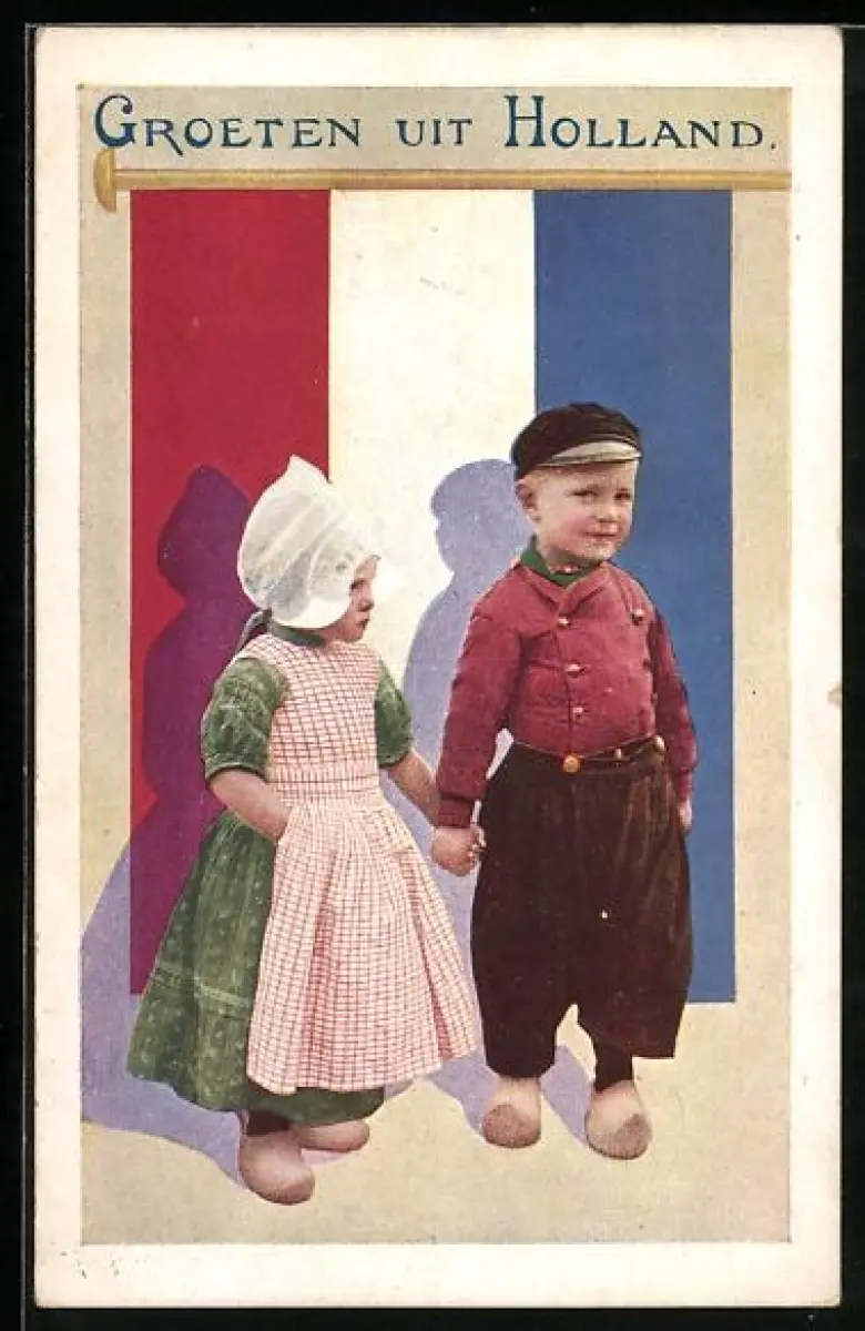 AK Niederländisches Kinderpaar vor der Fahne stehend
