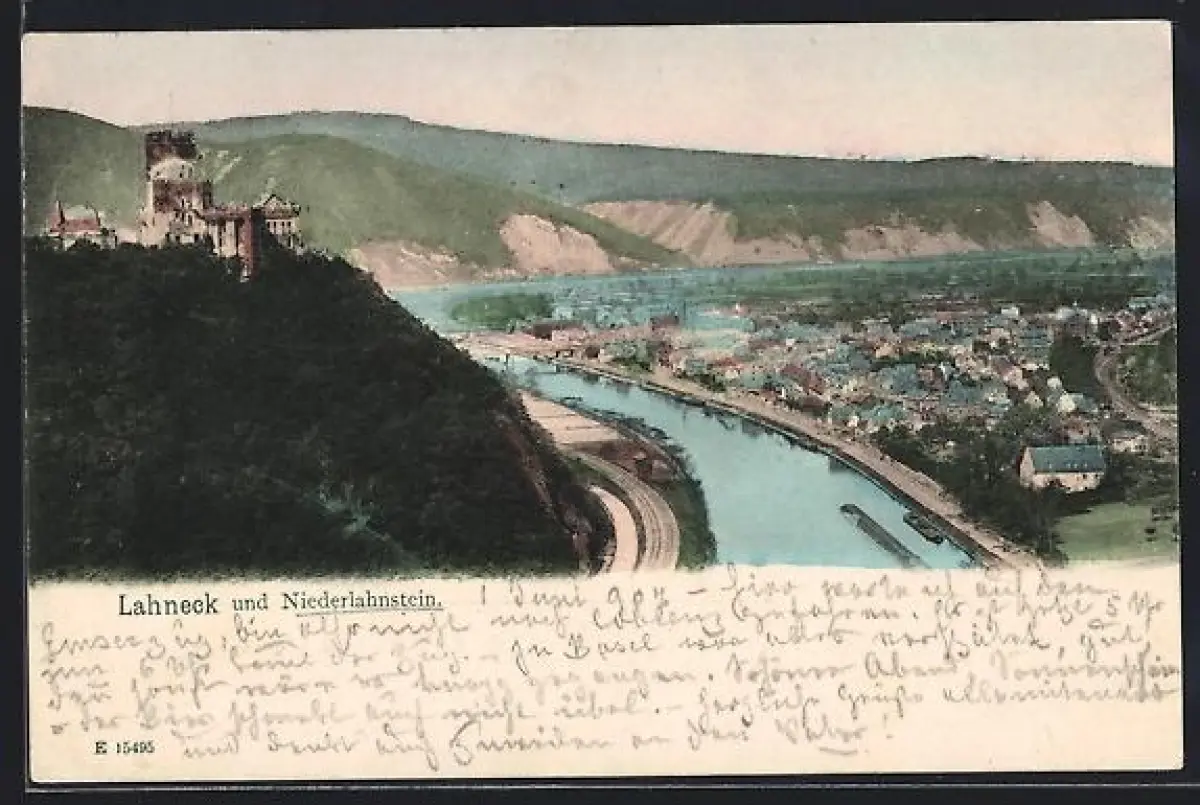 AK Niederlahnstein, Ortsansicht mit Lahneck aus der Vogelschau